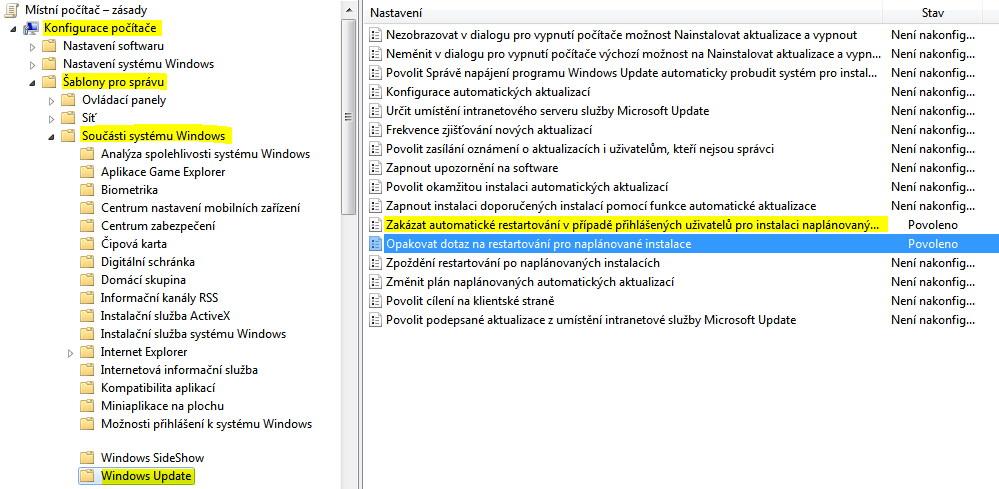 Volba Zakázat automatické restartování... je celkem jasná, nespustí se odpočítávání s následným automatickým restartem při nečinnosti uživatele po aktualizaci.
