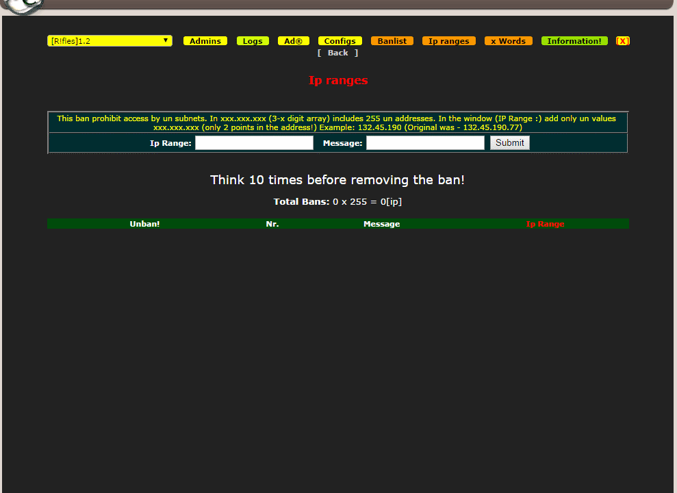 On the sly for the year slowly. Created a sql database, connected cron, wrote many new php scripts. Rewrote and improved the scripts and their performance. Players databases, ip-range bantool, nicname bantool, badnames works with sql, last player visits on server, easy players seraching in db, new js. scripts & more. Special mod plugins for cod1, cod2 and soon cod4 compatible with php cron. Left copyrights Ashus.