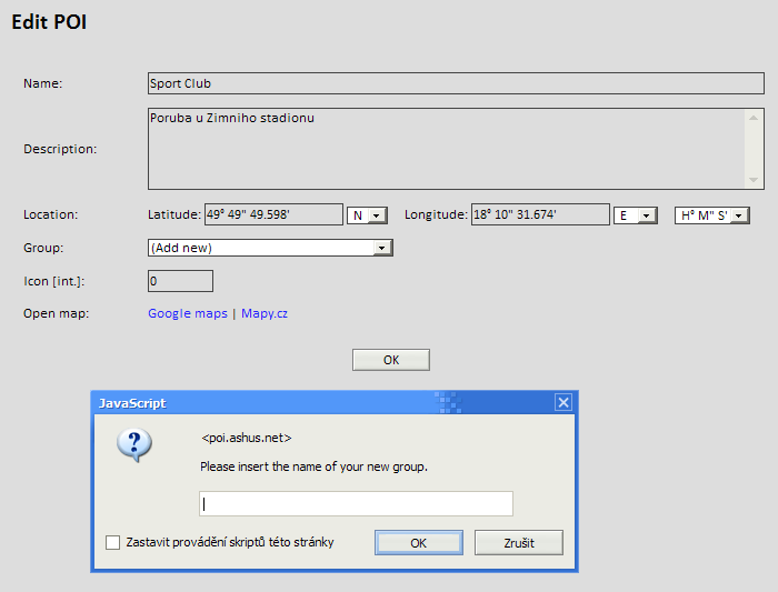 Aplikace vyžaduje povolený javascript, bez toho není možné upravovat jednotlivé POI ani je přesouvat do jiných skupin nebo mazat.